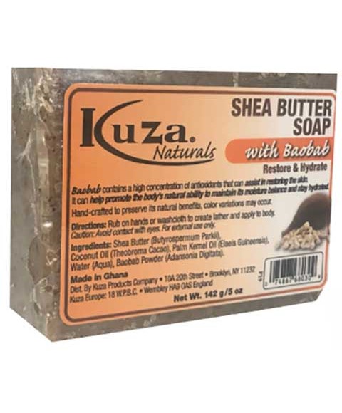 £2.99Description Naturals Shea Butter Soap With Baobab, baobab contains a high concentration of antioxidants that can assist in restoring the skin. It can help promote the body’s natural ability to maintain its moisture balance and stay hydrated. Hand-crafted to preserve its natural benefits.