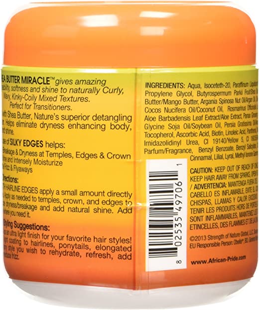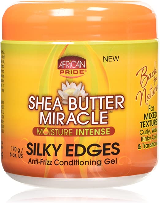 £2.99African Pride Olive Miracle moisturizing formula is enriched with extra virgin olive oil for the ultimate in silky smooth edges, ponytails and braids. Ideal for straight or natural slick styles non flaking, non sticky and non greasy. Contains no alcohol and no petrolatum. Directions: Use daily to slick down edges…