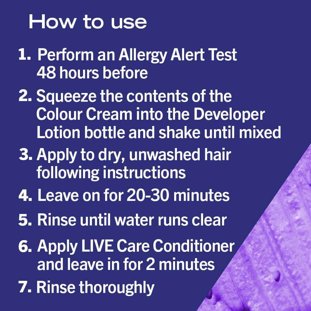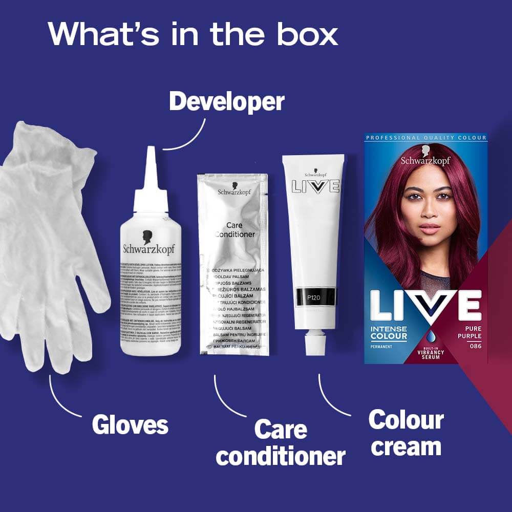 LIVE Intense Colour Pure Purple 086 is a permanent vegan formula hair dye designed for light blonde to dark blonde hair. Create your own unique look with a vibrant hue of colour and up to 50% grey coverage. The built-in Vibrancy Serum activates colour at the core of each hair strand for maximum colour depth, fade resistance and impressive shine.