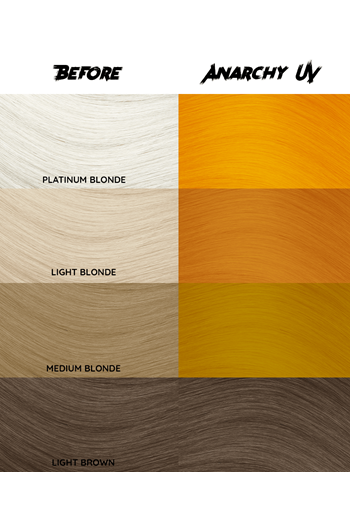 Part of our UV range, Anarchy UV is our yellow-toned orange that will glow in both natural light and backlight.?Use all over to create a bold head-turning orange, or use with other UV shades.?If you want to take your copper locks to a new dimension, mix Anarchy UV into Orange, Coral Red, or Fire.?We recommend lightening your hair to a level 9 or 10 (blonde) with our High-Lift Bleach Kit to create the perfect blank canvas for your dye.?Like all of our dyes, our Rebel UV semi-permanent hair dye is fully vegan and cruelty-free. It?s packed full of nourishing vegan ingredients that?ll leave your hair feeling soft and looking shiny after dyeing.?Our Bottles are 100ml