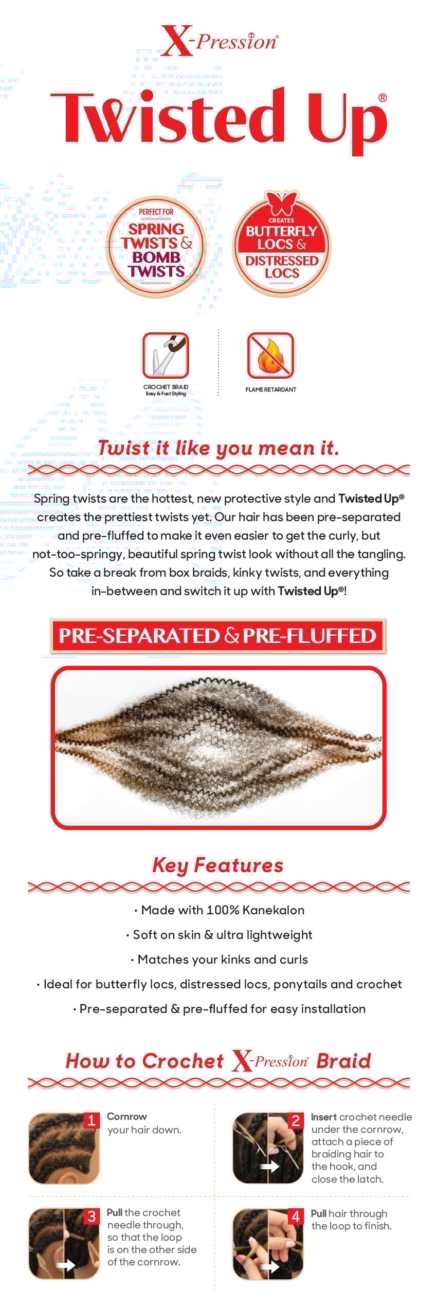 Springy twists are the hottest, new protective style and Twisted up creates the prettiest twists yet. Our hair has been pre-seperated and pre-fluffed to make it even easier to get curly, but not-too-springy, beautiful spring twist look with our all the tangling. So take a break from box braids, kinky twists, and everything in-between and switch it up with Twisted Up.